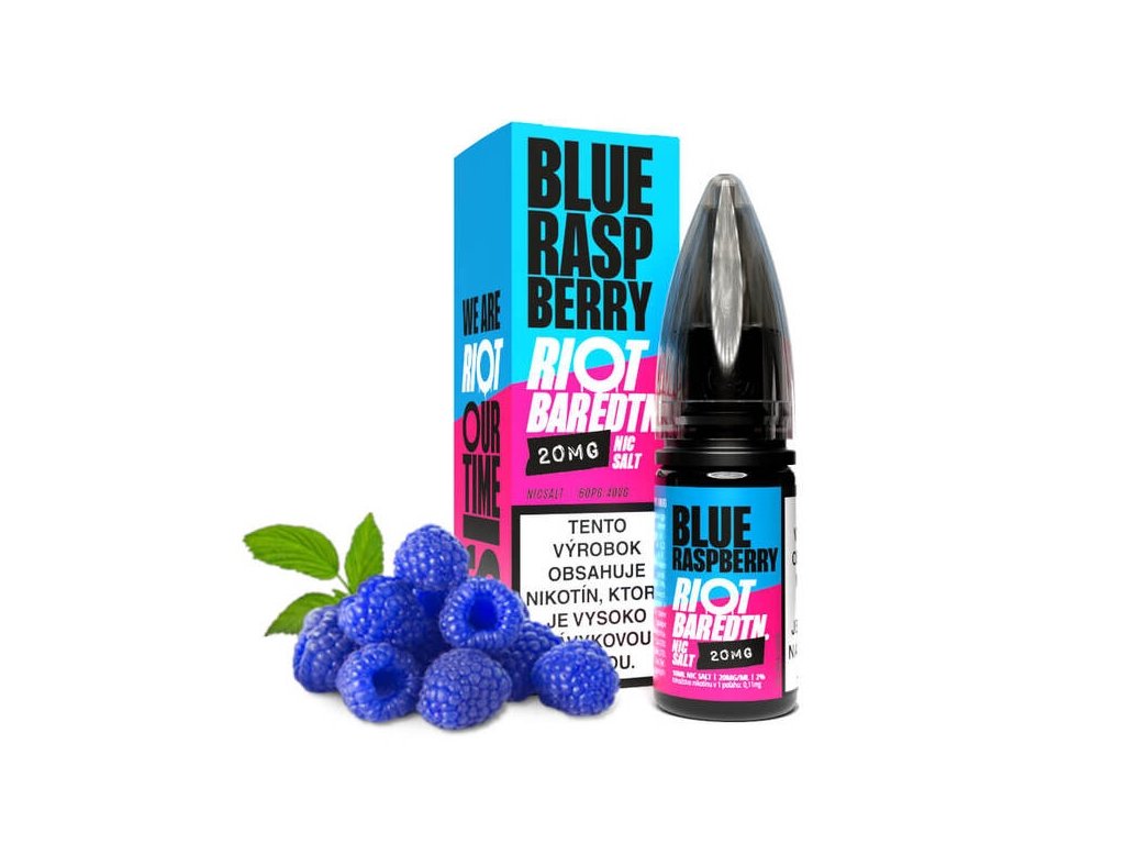 RIOT Bar Blue Raspberry e-liquid s ovocnou príchuťou, objem 10 ml, dostupný ako nikotínová soľ, ideálny na jemné ovocné vapovanie.