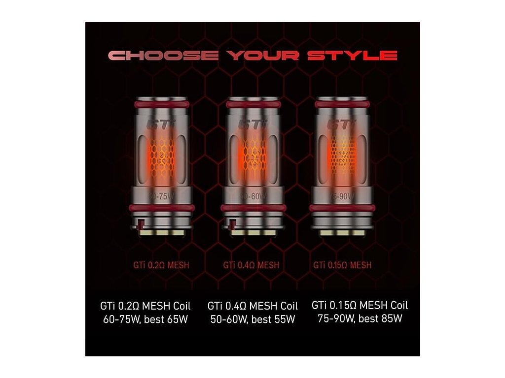 Žhaviace hlavy Vaporesso GTI Mesh predstavujú sériu výkonných mesh žhavičov určených pre DL vapovanie s dôrazom na bohatú chuť, veľkú produkciu pary a dlhšiu životnosť. Sú dostupné vo viacerých verziách odporu: 0,15 Ω • 0,2 Ω • 0,4 Ω • 0,5 Ω.